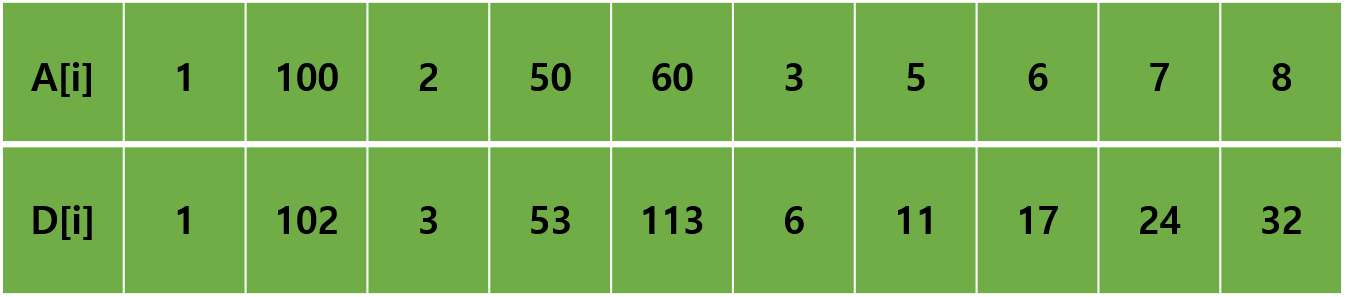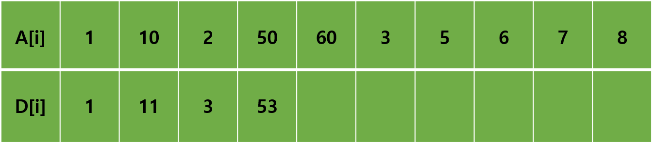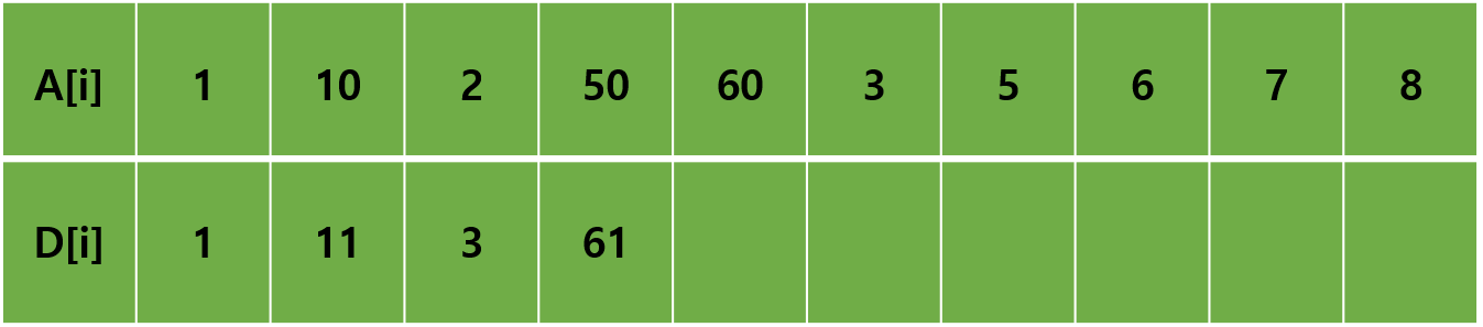 : 증가하는 수열이므로 위 조건을 만족해야만 한다. - D[i] < D[j] + a[i]