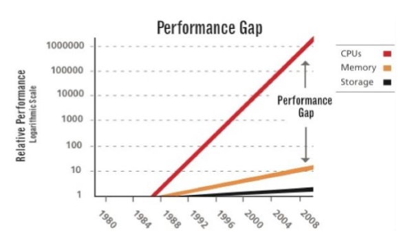 위의 경우와 비슷하게 CPU와 메인 메모리의 발전 속도도 차이가 나서 그 갭을 캐시를 이용하여 채워준다.