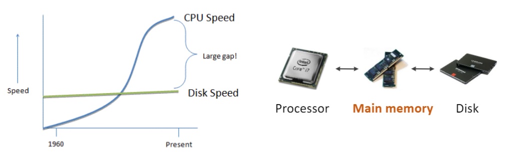 CPU 속도의 발전 속도를 디크스 속도 발전이 따라가지 못하여서 그 갭을 메인 메모리를 이용하여 채워주는 방식을 이용한다.