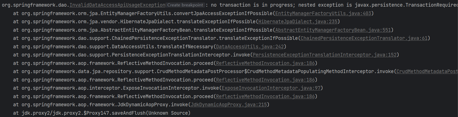 예상대로라면 트랜잭션이 이미 커밋되었기에 flush 를 할 시에 예외가 발생할 것입니다.