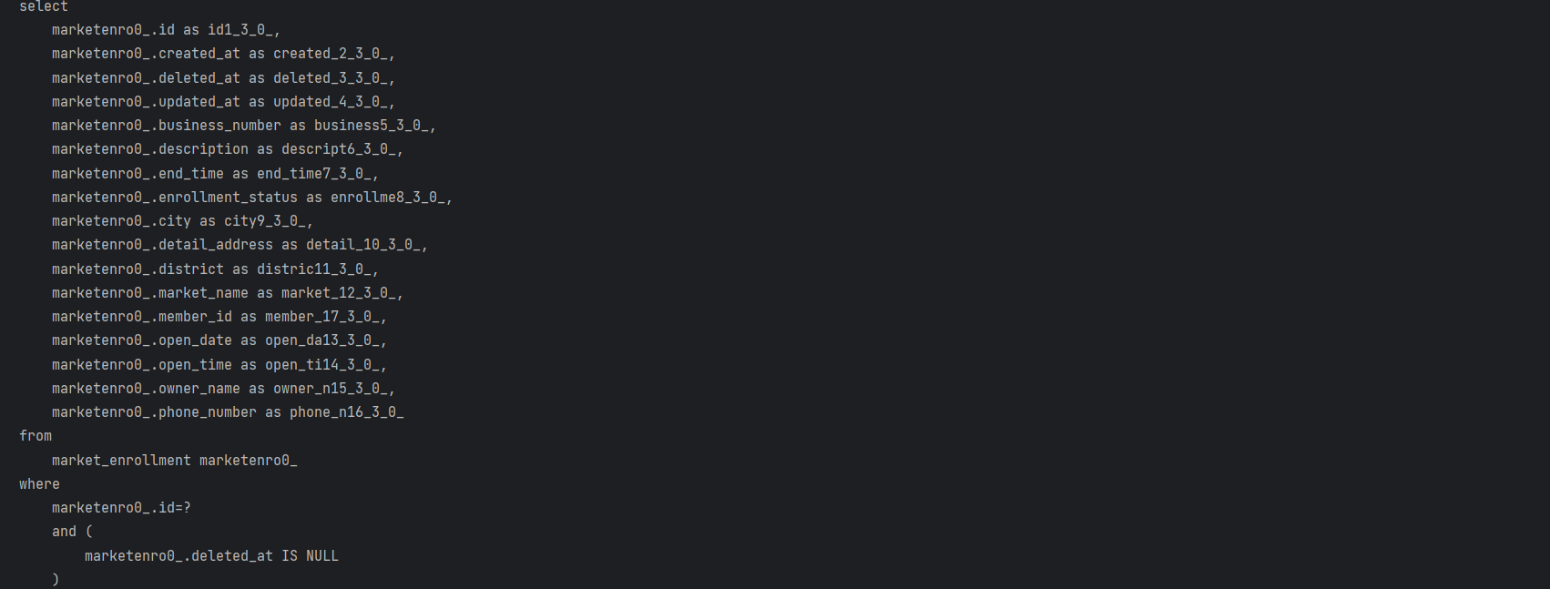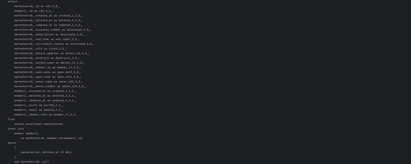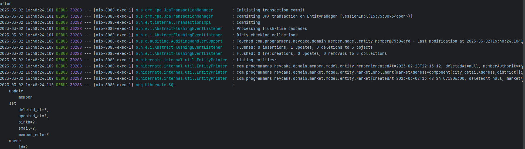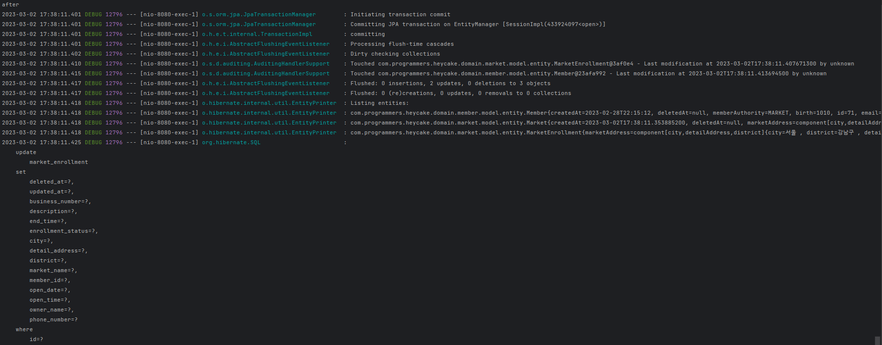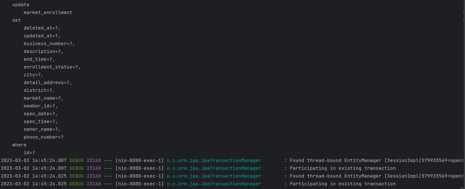 트랜잭션이 새로 열렸기에 영속성 컨텍스트에 없기 때문에 memberEnrollment 와 member 를 조회하고 market 을 저장한 후, member 상태 변경 쿼리가 변경 감지로 쿼리가 마지막에 나가는 것을 볼 수 있습니다.