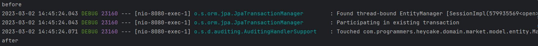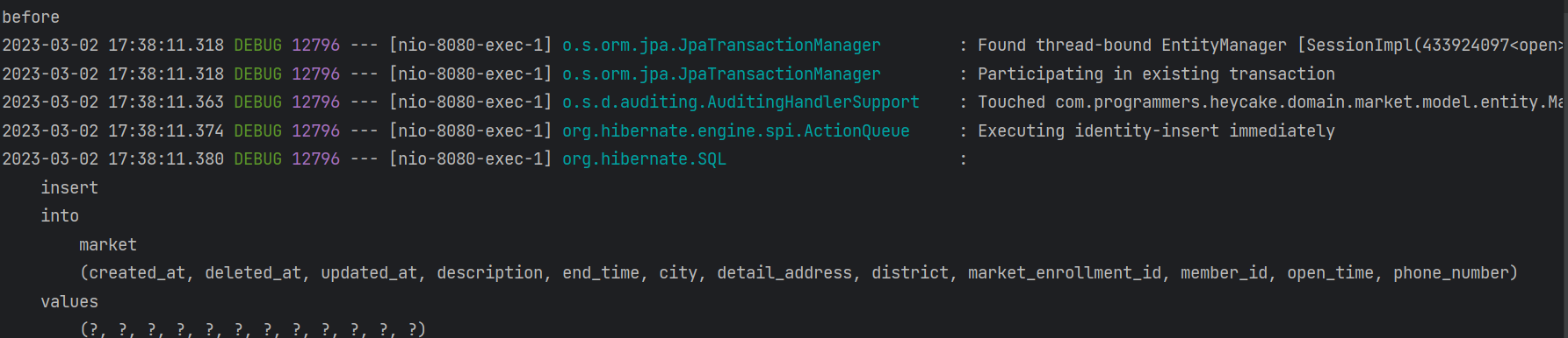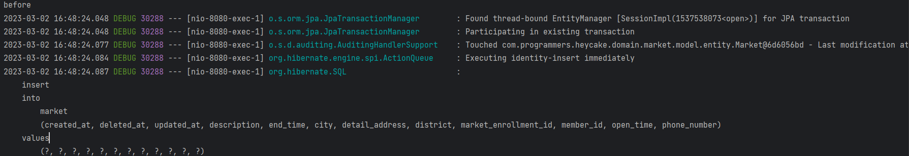 저는 처음에는 이벤트가 트랜잭션이 커밋되고 난 이후 실행되는 것이니 트랜잭션이 없기에 쿼리가 날아가지 않았구나라고 생각했는데, marketService.enrollMarket 내의