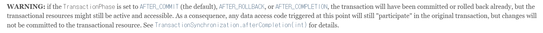 트랜잭션 단계가 AFTER_COMMIT(기본값), AFTER_ROLLBACK 또는 AFTER_COMPLETION으로 설정된 경우 트랜잭션은 이미 커밋되거나 롤백되었지만 트랜잭션 리소스는 여전히 활성화되어 있고 액세스할 수 있습니다. 결과적으로 이 시점에 트리거된 데이터 액세스 코드는 여전히 원래 트랜잭션에 "참여"하지만 변경 사항은 트랜잭션 리소스에 커밋되지 않습니다.