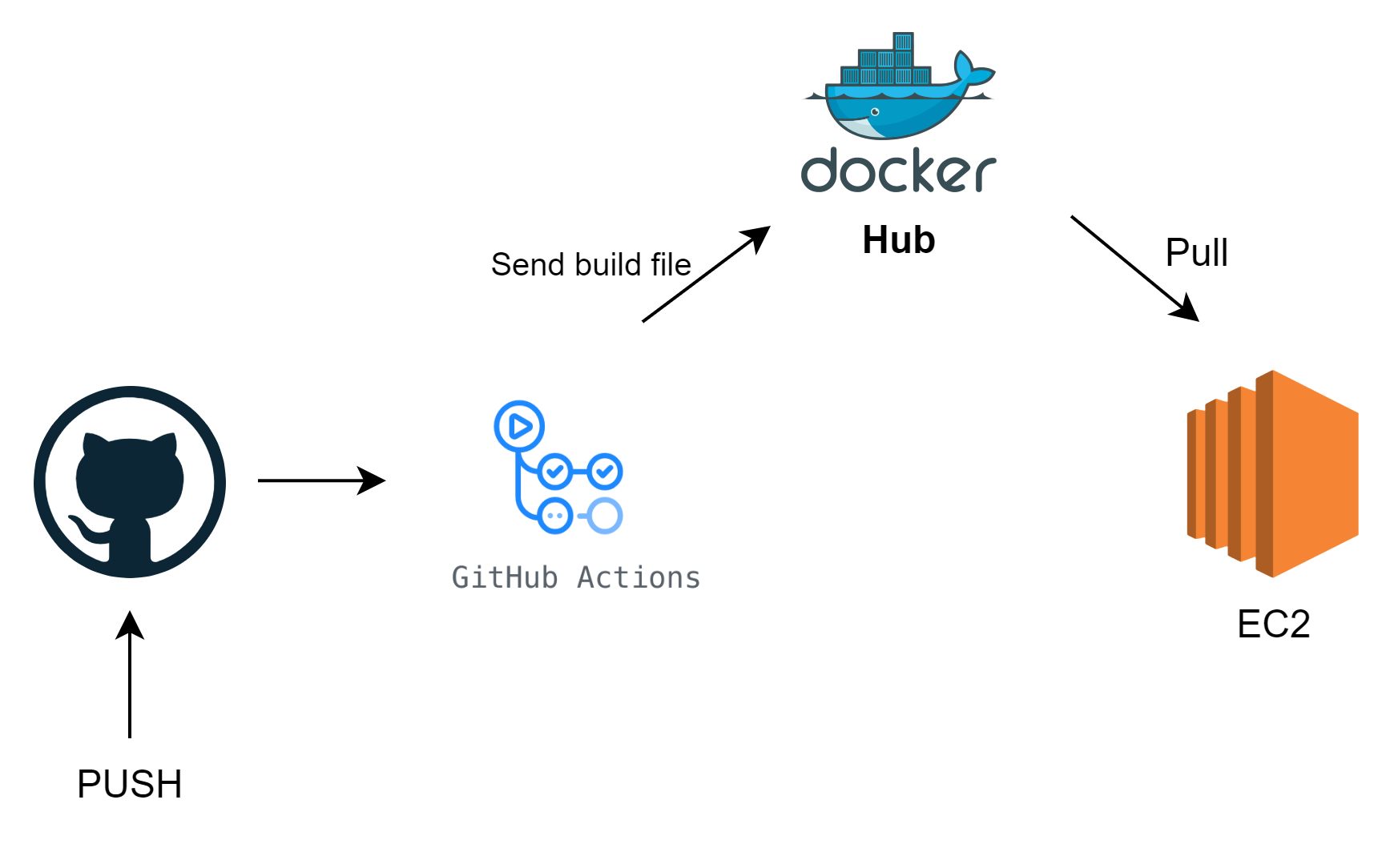 Github 에 소스코드를 push 하면 Github actions 를 통해 빌드하고 그 빌드된 파일을 바탕으로 docker 이미지를 만든다. 그리고 그 이미지를 docker hub 에 올린다. Github actions 의 서버에서 SSH 로 EC2 에 접속하여 EC2 에서 docker hub 에 올린 이미지를 pull 받아 실행한다.