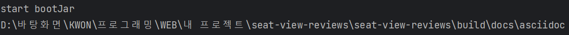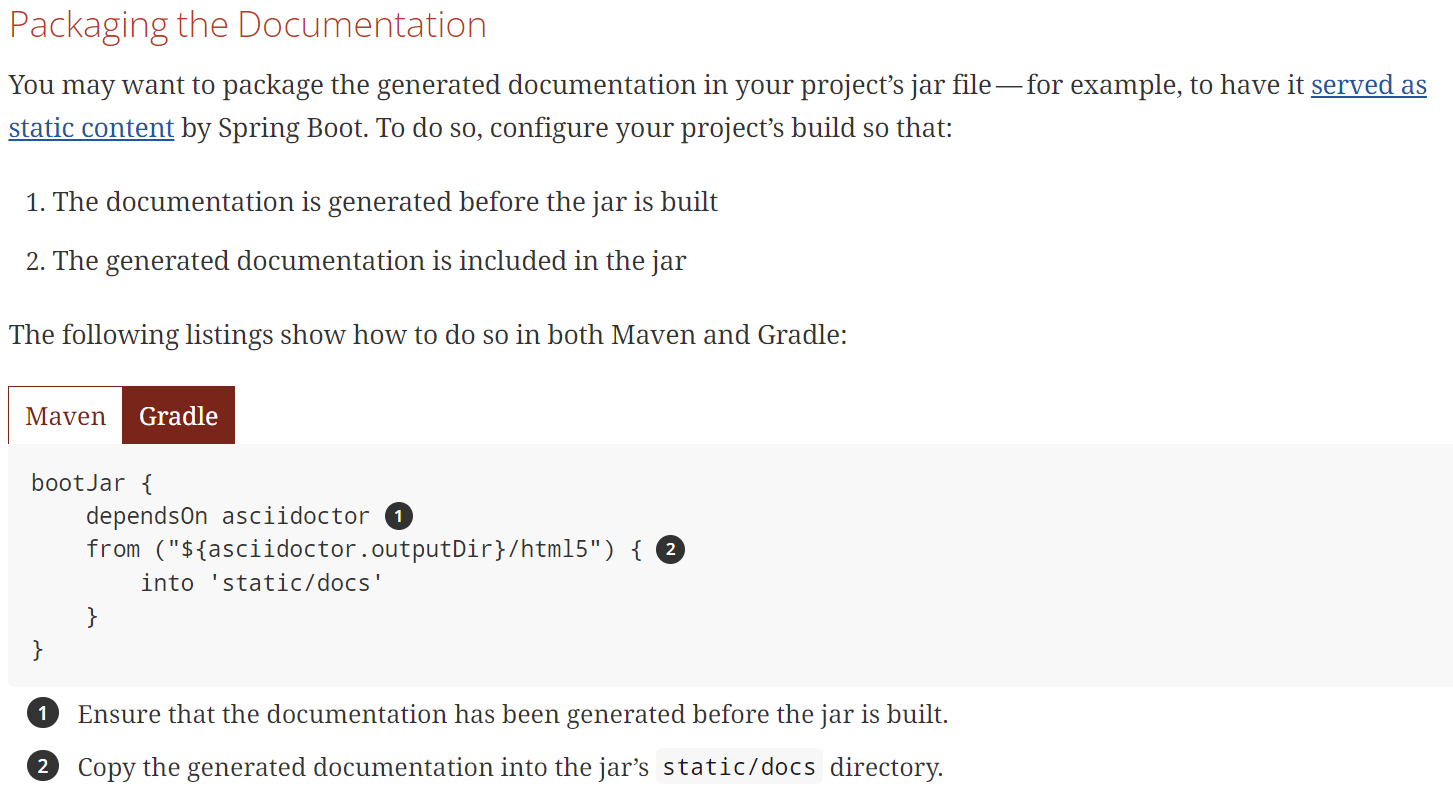 이를 바탕으로 HTML 문서를 jar 에 패키징하려면 위와 같이 build.gradle 에 작성하면 된다. 코드는 ${asciidoctor.outputDir}/html5 에 있는 파일을 jar 패키징 전에 static/docs 에도 두도록 하는 스크립트이다. 여기서 ${asciidoctor.outputDir} 는 위에서 봤듯이 build/asciidoc 이다.