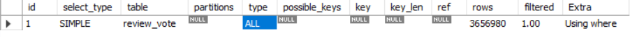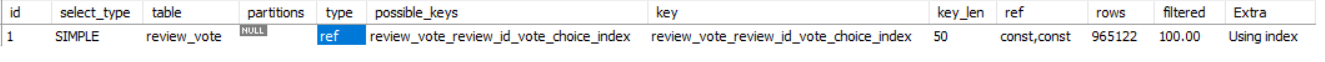 "SELECT COUNT(*) FROM review_vote WHERE review_id = ? AND vote_choice = 'LIKE';" 의 실행 시간을 확인해보면, 아래처럼 약 2초가 나온다. 그렇다면 조회 API 호출 시 약 쿼리 호출 시간으로만 약 4초가 걸린다.