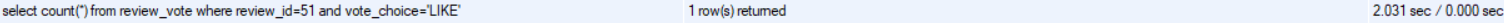 "SELECT COUNT(*) FROM review_vote WHERE review_id = ? AND vote_choice = 'LIKE';" 의 실행 시간을 확인해보면, 아래처럼 약 2초가 나온다. 그렇다면 조회 API 호출 시 약 쿼리 호출 시간으로만 약 4초가 걸린다.