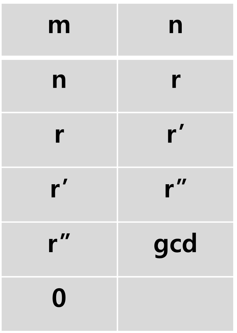 이 성질을 이용하면 n을 r로 나눈 나머지 r'을 구하고, 다시 r을 r'로 나눈 나머지 r''을 구하고, 다시 r'을 r''로 나눈 나머지를 구하는 과정을 계속 반복해서 나머지가 0이 되었을 때의 나누는 수가 m과 n의 최대공약수가 된다.